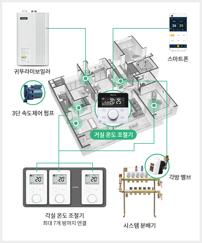 각방마다 별도의 실내 조절기를 설치하여 각 방의 실내온도를 따로따로 조절하는 에너지 절약 자동 난방시스템입니다. 각방의 난방이 필요하지 않는 경우에는 자동으로 밸브를 닫음으로서 불 필요한 에너지의 낭비를 막고 연료비를 절감할 수 있는 귀뚜라미의 혁신적인 시스템입니다.